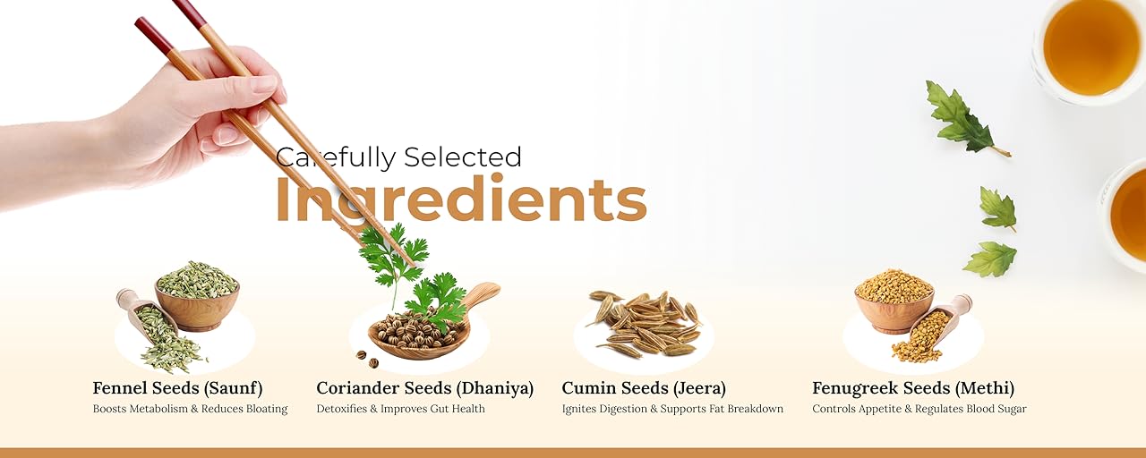 The Kadha contains a potent mix of natural ingredients, including: Cumin (Jeera), Fennel (Saunf), Coriander (Dhania), and Fenugreek (Methi).